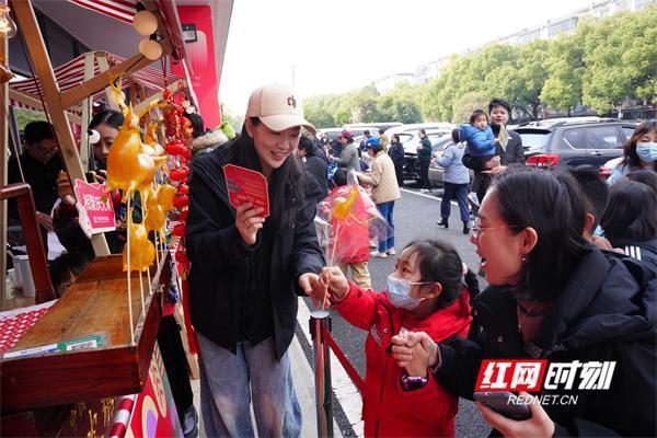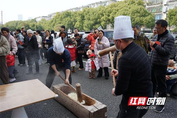 打糍粑。步入省委机关图书馆,喜庆的红灯笼,散发着墨香的春联,橱窗玻璃上贴的各式窗花,烘托着浓厚的传统佳节氛围。在这里,传统文化与现代创意相互融合,非遗技艺成为连接过去与现在的桥梁。江永女书、剪纸、面塑、糖画、吹糖人、手作糕点、打糍粑、煮元宵……十余个非遗摊位前,挤满了前来游玩和体验的大小读者。